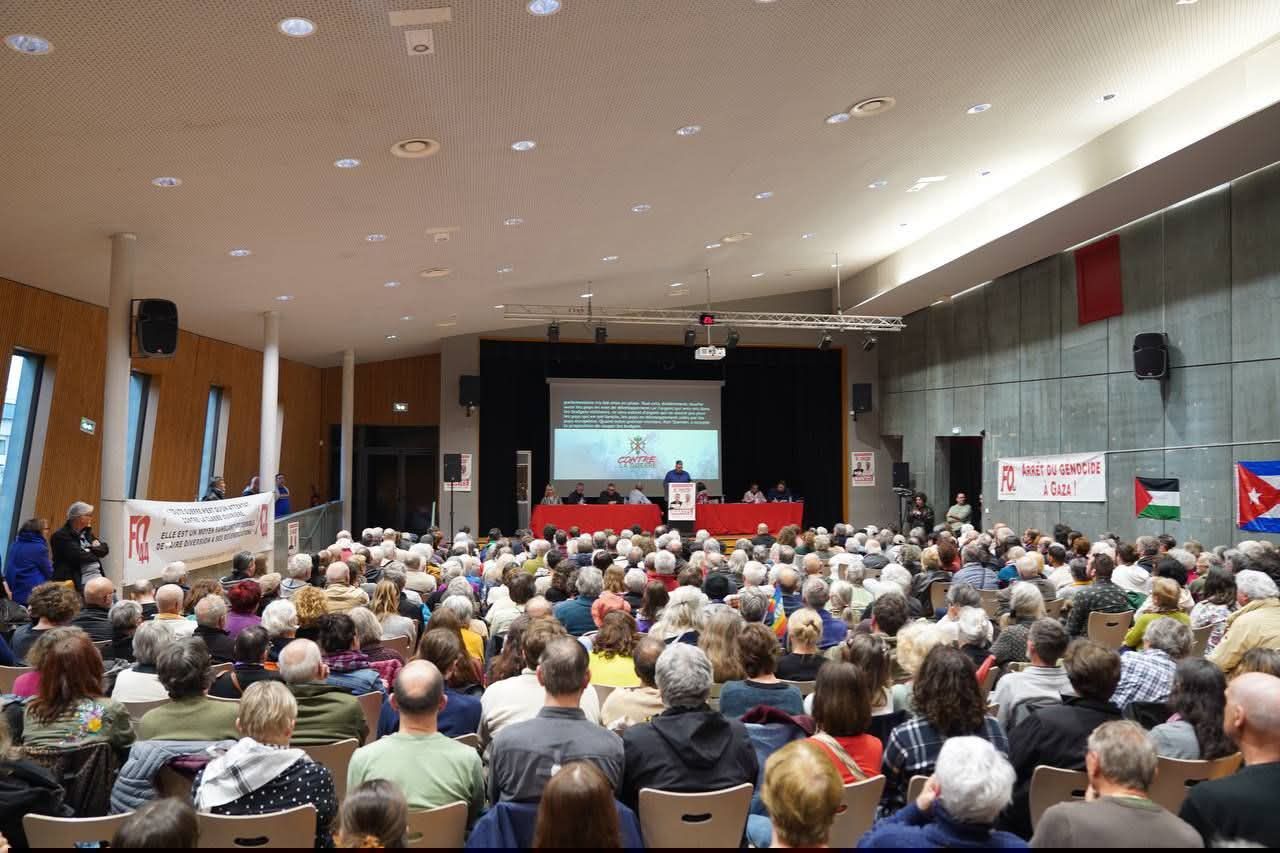 The first meeting in Nantes had a lively 470 strong audience and was standing room only. The meeting passed an emergency message of solidarity with Chris Nineham and Ben Jamal who had outrageously been found guilty earlier that day of charges relating to a peaceful Palestine protest.