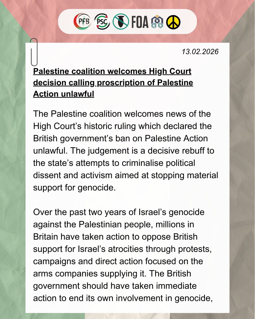 The Palestine coalition welcomes news of the High Court’s historic ruling which declared the British government’s ban on Palestine Action unlawful. The judgement is a decisive rebuff to the state’s attempts to criminalise political dissent and activism aimed at stopping material support for genocide.