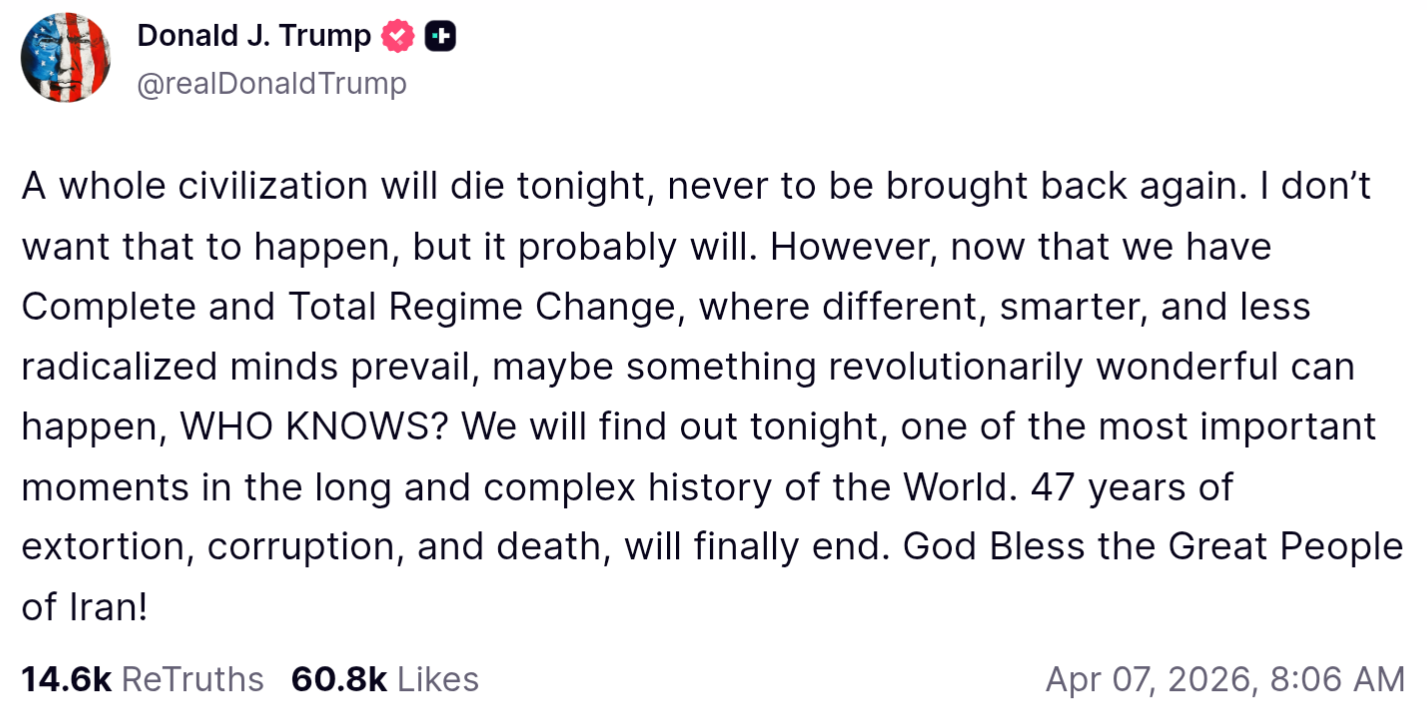 In a subsequent post, Trump asserted that Iran had agreed to keep the Strait of Hormuz open during the two-week pause in hostilities. Negotiations, he added, will proceed over that period on the basis of Iran’s 10-point plan, which he described as a “workable” foundation for talks.