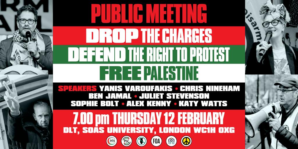 We’re organising a public meeting on Thursday 12 February, 7pm at SOAS in Central London to discuss the implications of the attacks on the Palestine movement and the right to protest. Speakers include actor Juliet Stevenson, Yanis Varoufakis, Chris Nineham, Ben Jamal and Katy Watts from Liberty.