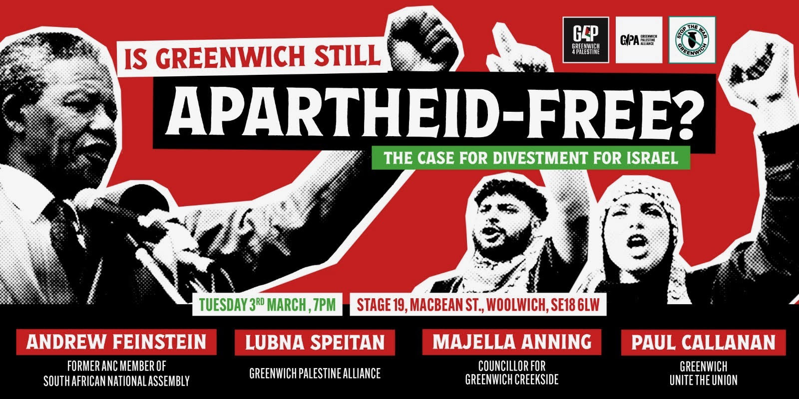In the 1980s, Greenwich Council declared itself an ‘apartheid-free zone’, cutting all ties with apartheid South Africa. Yet today they hold over £61 million of pension investments in apartheid Israel. Come hear the case for divestment now from a line-up leading activists:
