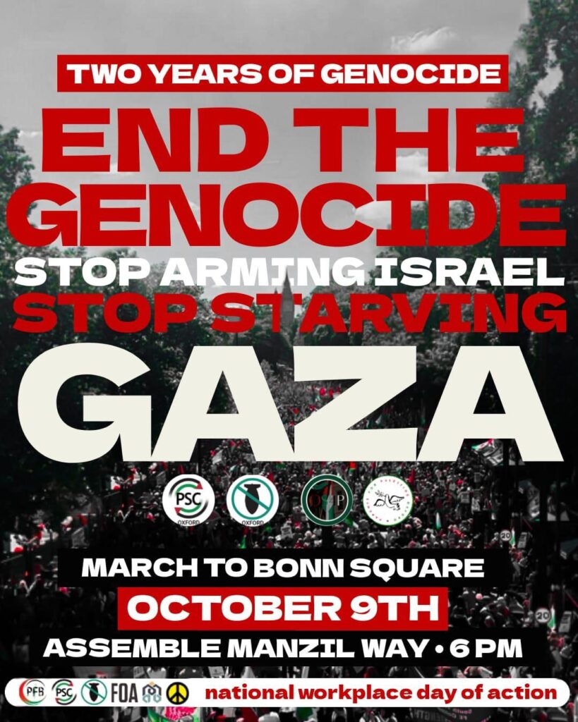 In Oxford, for the Workplace Day of Action, Oxford University UCU, Oxford Brookes UCU, and Unite Health, are supporting an evening march for Palestine. October 9th, assemble at Manzil Way 6pm and march to Bonn Square.