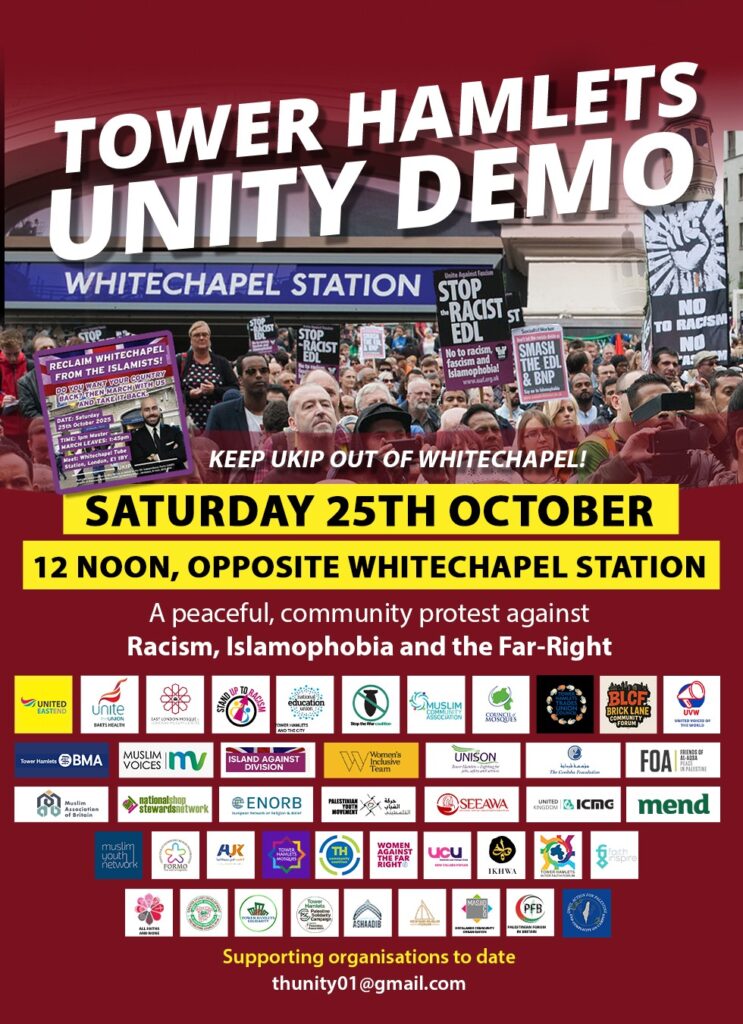 On 25 October StW will be supporting the Unity Demo Against the far-right and Islamophobia in Tower Hamlets, London. We will be gathering at 12 noon opposite Whitechapel Station.